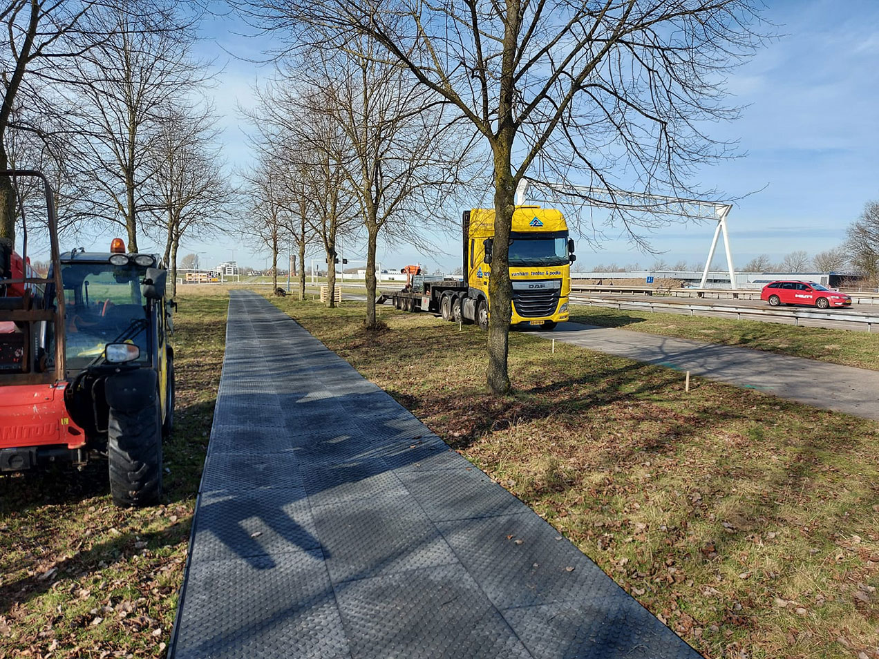 Onze installatie methode van kunststof rijplaten is een proces dat zich onderscheidt door de snelheid en het gemak van de plaatsing en verwijdering. Onze kundigheid stelt ons in staat om tot wel 2 kilometer aan paden te leggen in slechts één dag. Deze efficiëntie is te danken aan het feit dat kunststof rijplaten licht van gewicht zijn en handmatig geplaatst kunnen worden. Hierdoor zijn geen zware machines of grote voertuigen nodig. Dit verhoogt niet alleen de snelheid van de plaatsing, maar ook minimaliseert het de impact op het milieu. Door te kiezen voor een handmatige aanpak blijven we flexibel en milieuvriendelijk, wat niet alleen gunstig is voor de directe omgeving, maar ook past binnen onze toewijding aan duurzame bedrijfsvoering.