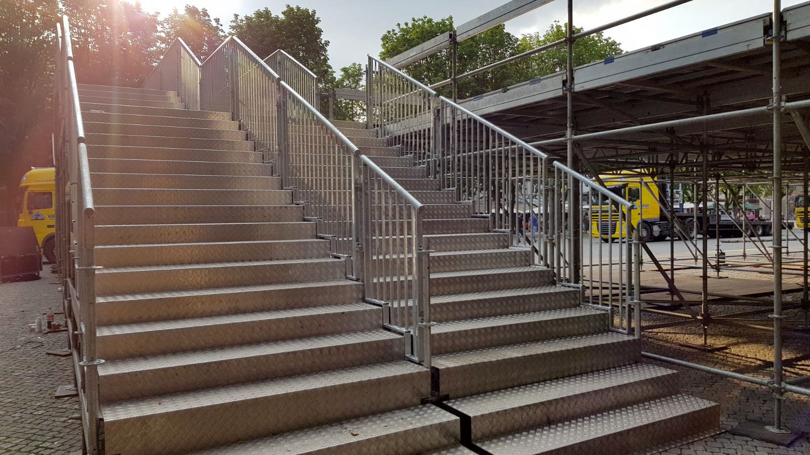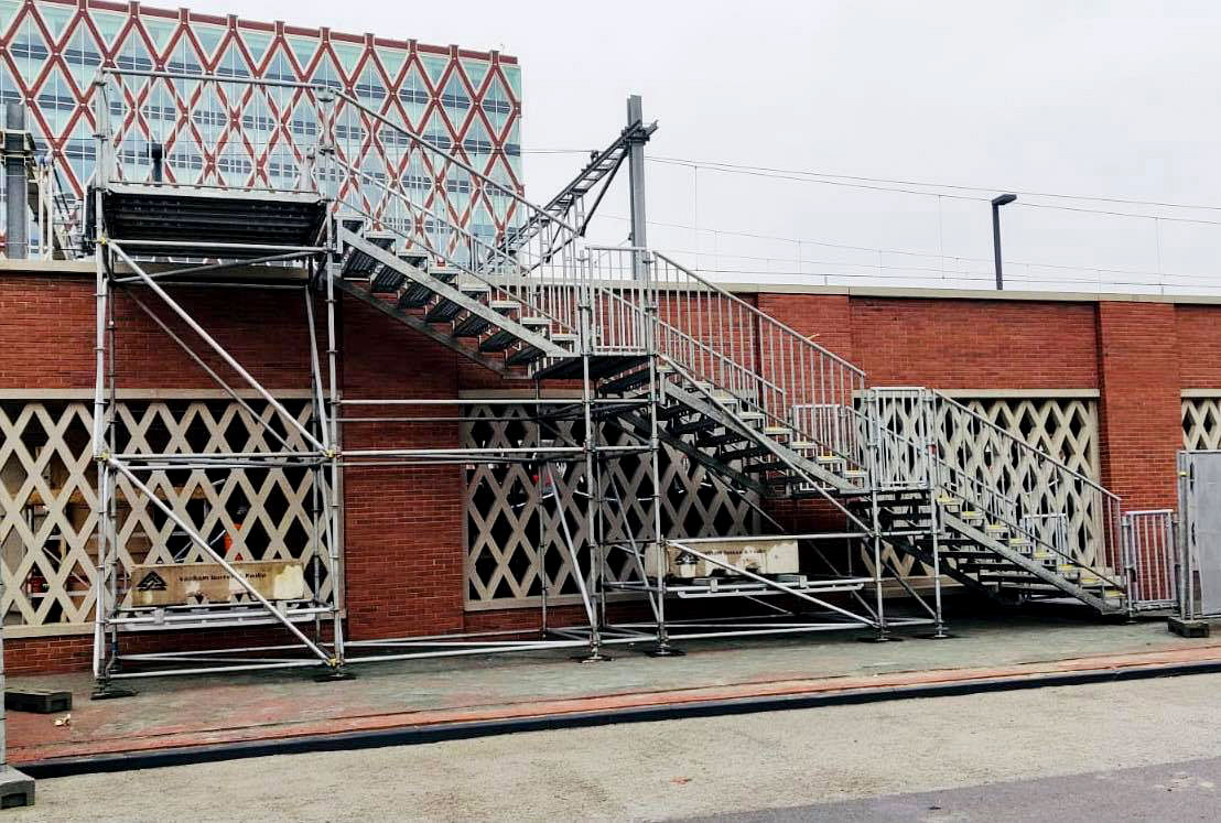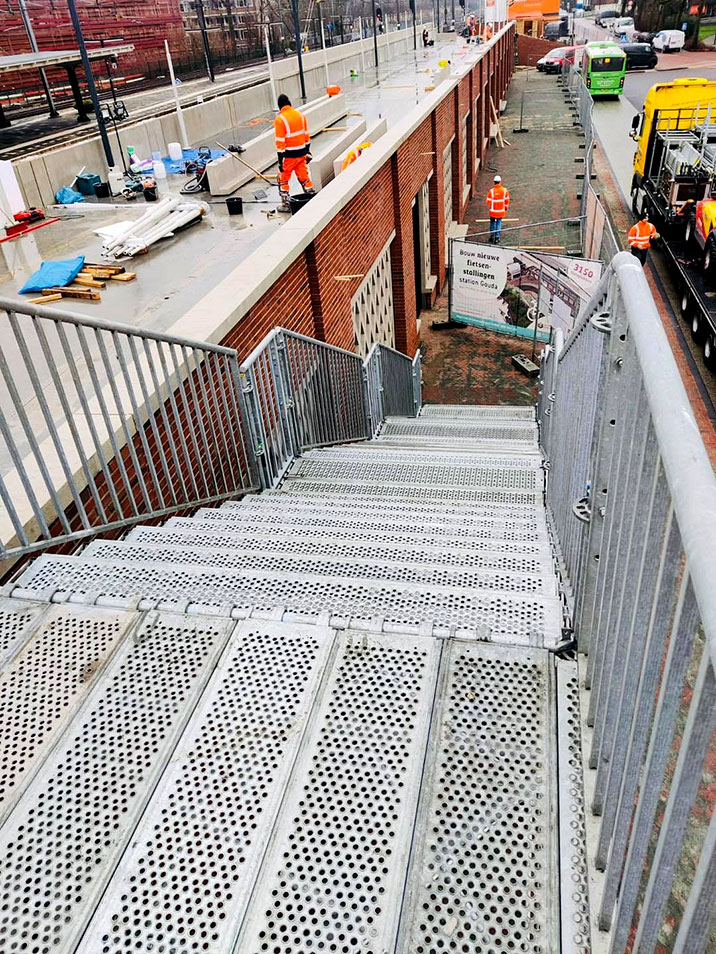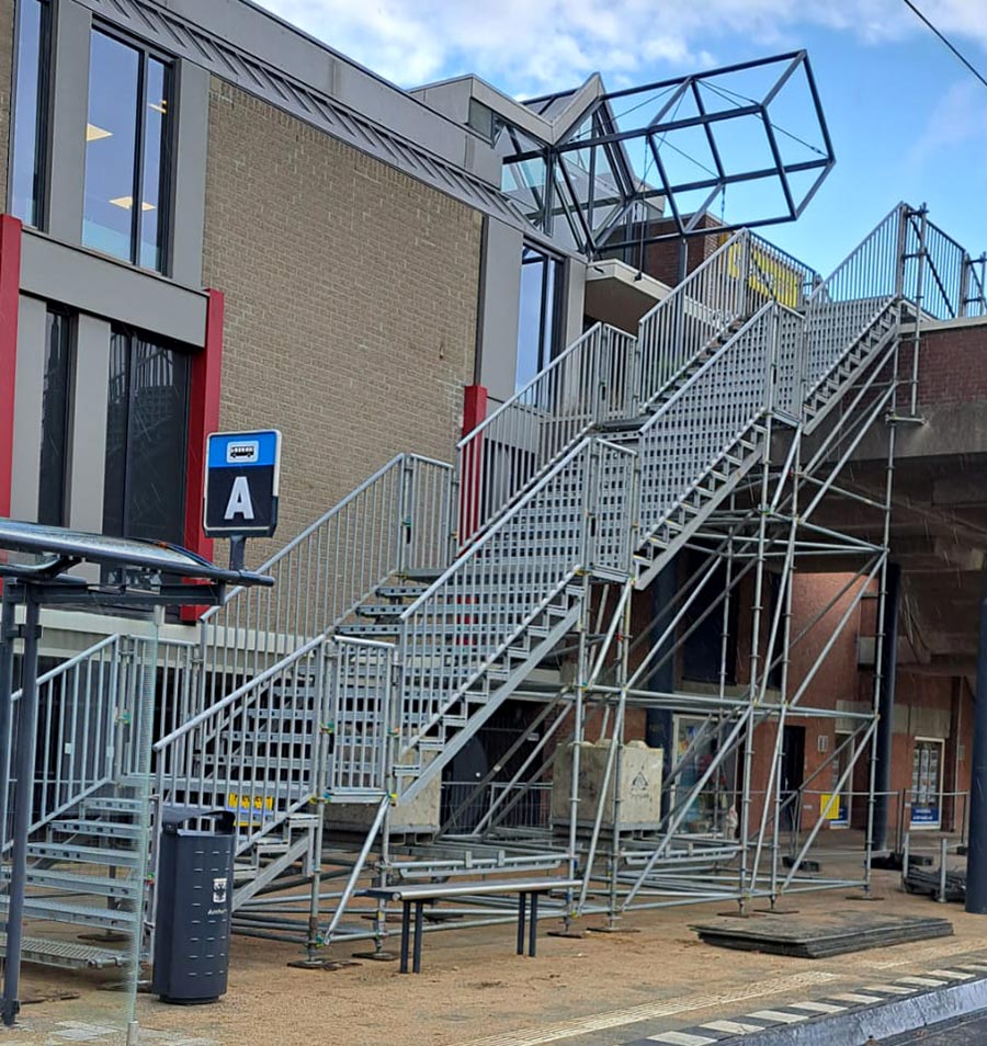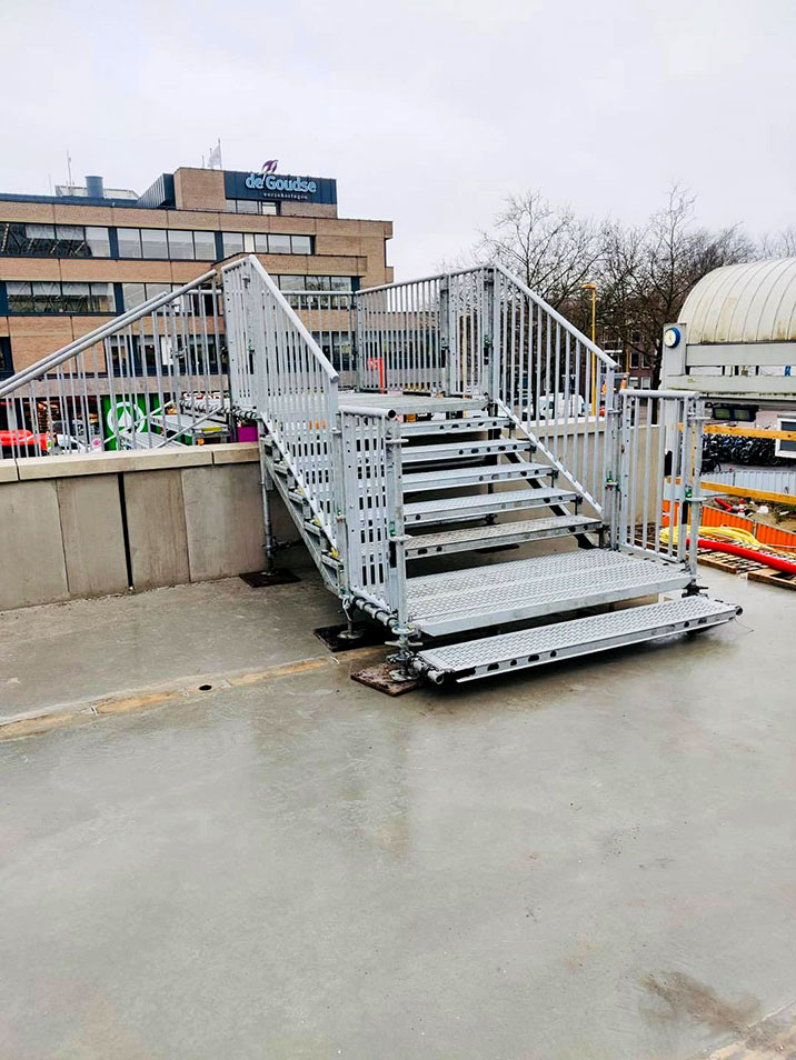 Met meer dan 40 jaar ervaring met steigermateriaal, weten wij als geen ander hoe wij een tijdelijke trap kunnen realiseren die voldoet aan al uw wensen en behoeften. Voor de realisatie van de tijdelijke trap gebruiken wij steigermateriaal. Dit geeft ons veel flexibiliteit en stelt ons instaat om vele verschillende soorten trappen te realiseren. Elke locatie is uniek, en daarom ontwikkelen we voor elk project een tijdelijke trap die perfect past op de locatie.