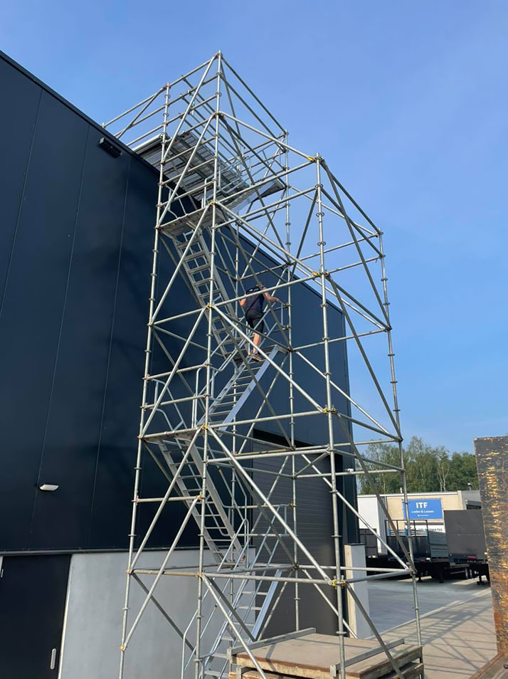 Wij creëren op maat gemaakte trappentorens van steigermateriaal, afgestemd op uw specifieke wensen en behoeften. In plaats van standaard formaten hebben wij ervoor gekozen om geen trappentorens met vaste afmetingen in ons assortiment op te nemen. Elk project is uniek, en daarom ontwikkelen we voor elk project een trappentoren die perfect past op de locatie.