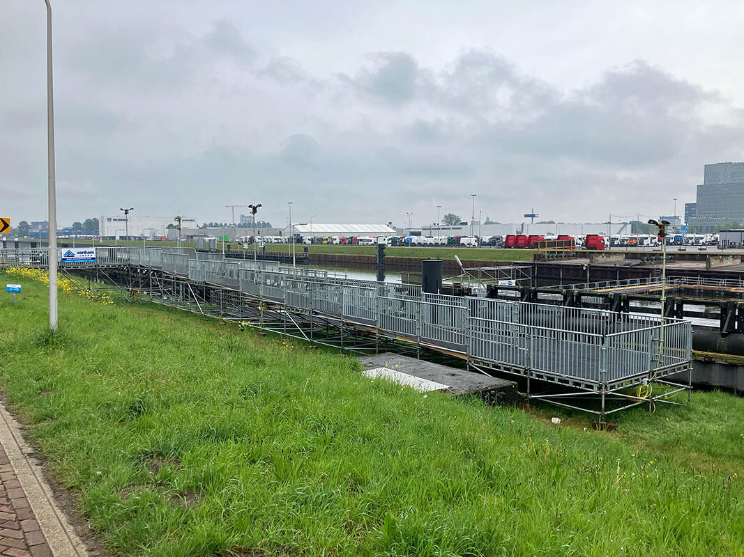 Easy Pontons benaderde ons met de vraag of wij een tijdelijke brug konden realiseren, deze moest aansluiten op de walkant en gebouwd worden bovenop hun drijvende pontons.